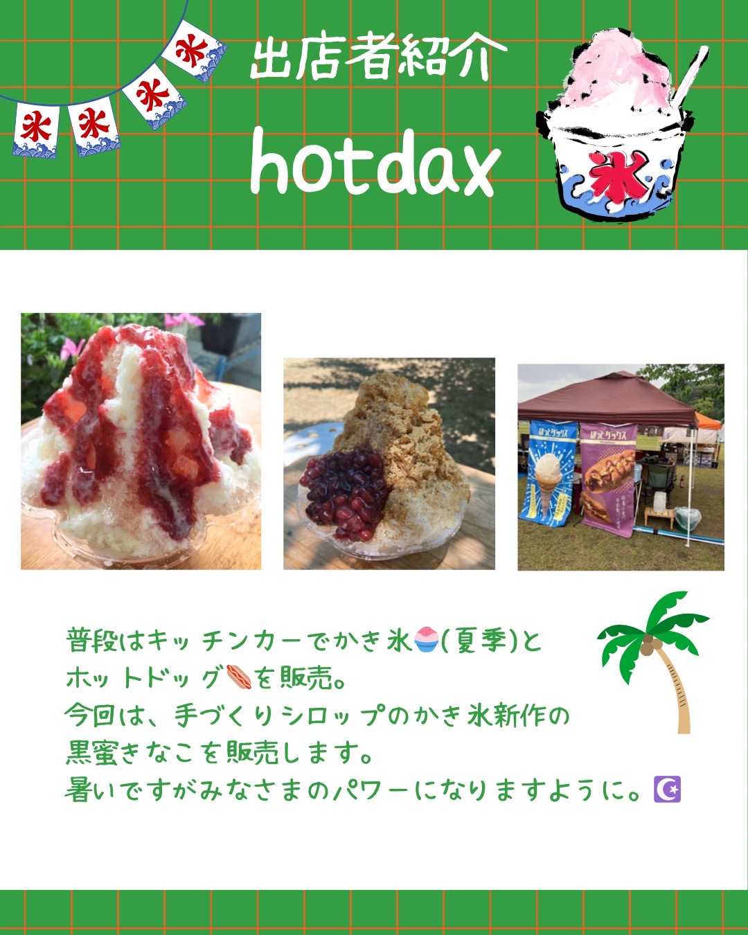 キッチンカー歴6年目に突入しましたホットダックスです 主にホットドッグを販売しています 国産小麦を使用しパンを手作りしています 無添加で安全な素材を厳選しより美味しいものを 提供できるよう努力しています 是非一度ご賞味ください